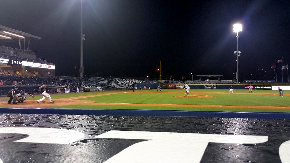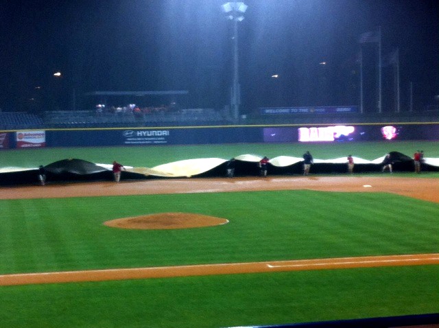 Sierra reached on an infield single, but Eibner was out at the plate as he tried to come around and score from second on the play. The game moved on to the bottom of the 10th. And then the rain came. It started out as a steady drizzle that sent the fans in the lower seats rushing for the cover of the overhanging upper deck.