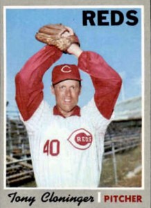 From 1968-1971, Cloninger appeared in 110 games for the Reds, made 77 starts, and had a record of 27-33 with a save and a 4.31 E.R.A. He made one start in the 1970 National League Championship Series and made a start and one relief appearance in the 1970 World Series. Cloninger hit one home run in 1968, two in 1969, and two more in 1970.