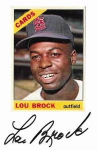 In 2011 Brock was on hand signing autographs before a game at Turner Field. My son and I stood in line in the August heat to get a couple of signatures. When I handed Brock a printed photo of his 1966 Topps card, he grinned and thanked us for stopping by to see him; he was so polite and unassuming. When I told him that he hit the first home run I ever saw, he asked, “When was that?” When I said, “May of 1967,” he said, “That was a long time ago.”