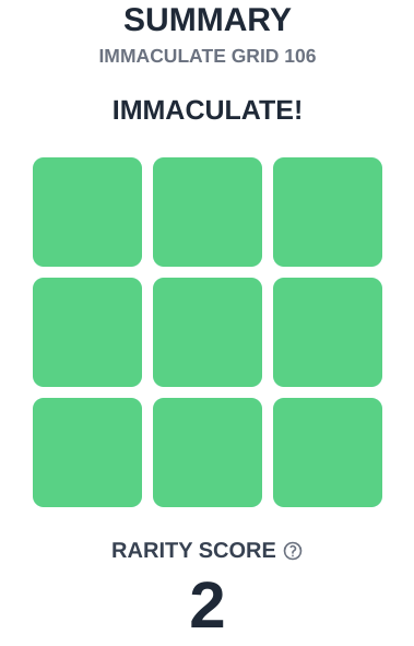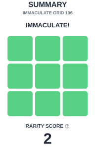 You must complete the Grid in nine guesses, and each blank square adds 100 points to your final score. The lowest score I have obtained so far is 2 on Grid #106 (pictured above) on July 17, but I usually land somewhere around 45.