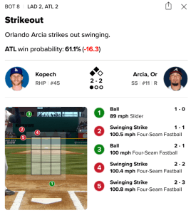 Last night, the Atlanta Braves and Los Angeles Dodgers were tied 2-2 going into the bottom of the eighth inning. Marcell Ozuna led off with a five-pitch walk against Michael Kopech. The next hitter, Matt Olson, took the first pitch for a ball, and then got a middle-in fastball that he drove off the wall in right-center field. The Braves were in business with two runners in scoring position with no outs.