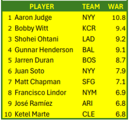 I also included a table showing the 2024 ML Leaders in WAR (batters only). I find it odd that Matt Chapman made the list, apparently due to his defensive prowess. But Ohtani, Marcell Ozuna, and Brent Rooker were full-time designated hitters; therefore, it doesn’t appear that a total lack of contribution on defense hurts a player’s WAR very much.