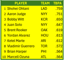 I’ve included a table showing the 2024 major league leaders in OPS and another table showing how those players rank in TBPA. Shohei Ohtani was second to Aaron Judge in OPS, but Ohtani had a higher TBPA. Ohtani stole 59 bases while being caught only four times. Judge was a perfect 10 for 10 in stolen base attempts, but Ohtani netted a whopping 55 bases for his total. Judge also grounded into 22 double plays compared to Ohtani who grounded into seven.